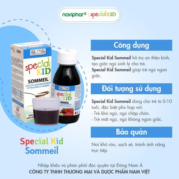 Special Kid Sommeil được nhập khẩu nguyên hộp từ Pháp do Công ty TNHH Thương mại và Dược phẩm Nam Việt phân phối độc quyền. Sản phẩm có dạng siro đậm đặc, hương dâu chua ngọt phù hợp với khẩu vị của trẻ và chỉ cần uống một lần trong ngày theo liều lượng hướng dẫn sử dụng.